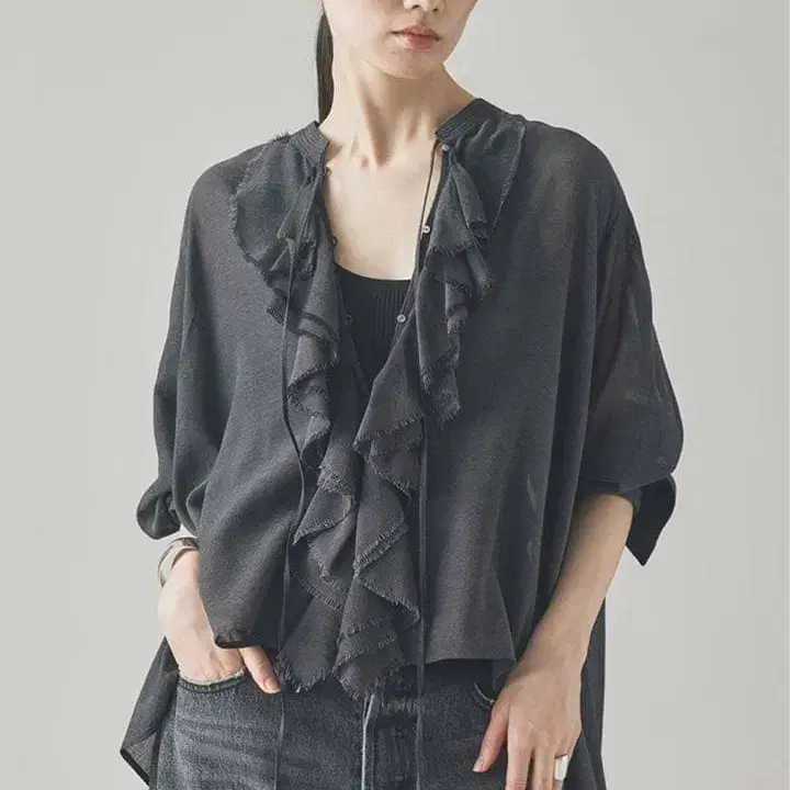 이번 시즌 캘런솔로지의 울 믹스 보일 프릴 블라우스 그레이입니다.