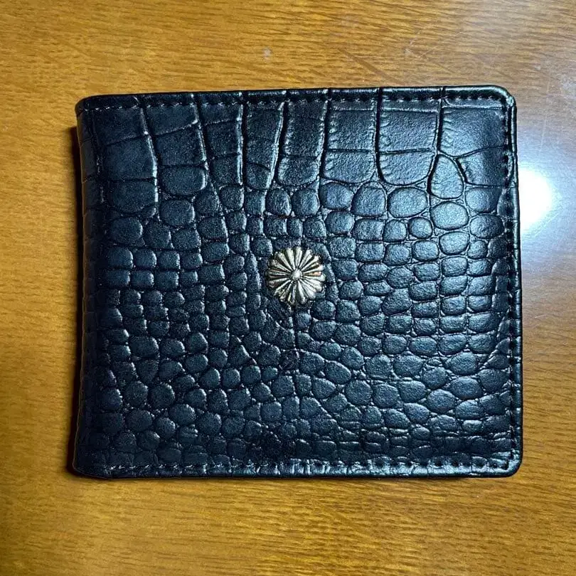 국화 문양 블랙 가죽 이단 접이식 지갑 크로커다일풍