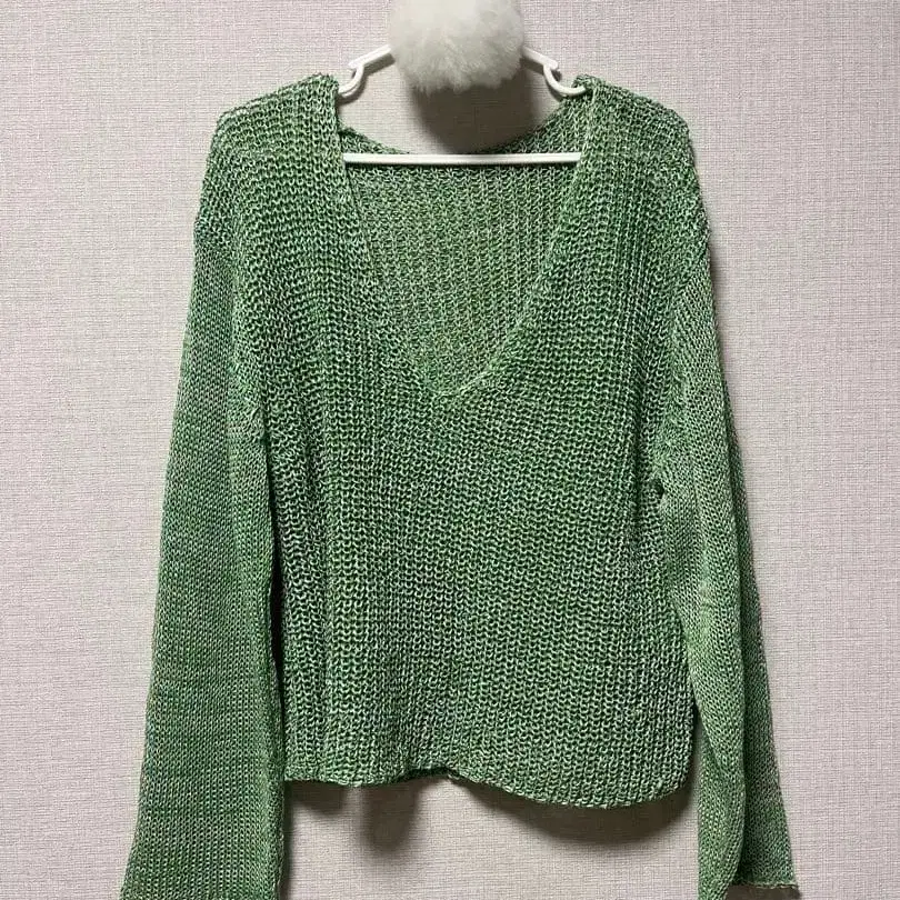 V넥 디자인의 그린 컬러 니트 스웨터, 긴팔로 착용감이 쾌적합니다.