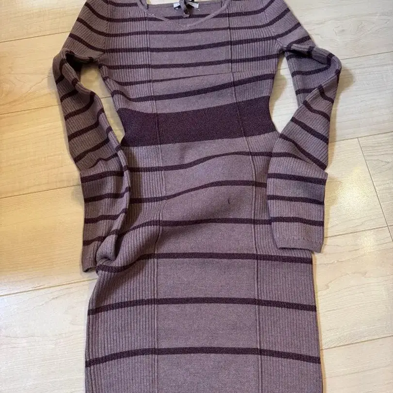 리브 편직의 브라운과 보라색 스트라이프가 특징인 긴팔 니트 원피스. - 브랜드: LIP SERVICE - 색상: 브라운, 보라색 스트라이프 - 스타일: 니트 원피스 - 소매 길이: 긴팔 - 디자인: V넥, 리본 포함 - 소재: 리브 편직 방문해 주셔서 감사합니다. 사이즈 - FREE SIZE