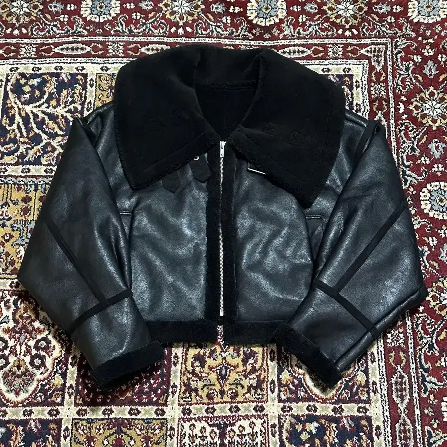 MURUA의 오버 컬러 숏 페이크 무스탕입니다. 짧은 기장의 실루엣으로 스타일업 효과를 주는 무스탕이며, 색상은 블랙입니다.見た目に反して軽くストレスを感じない仕様です.