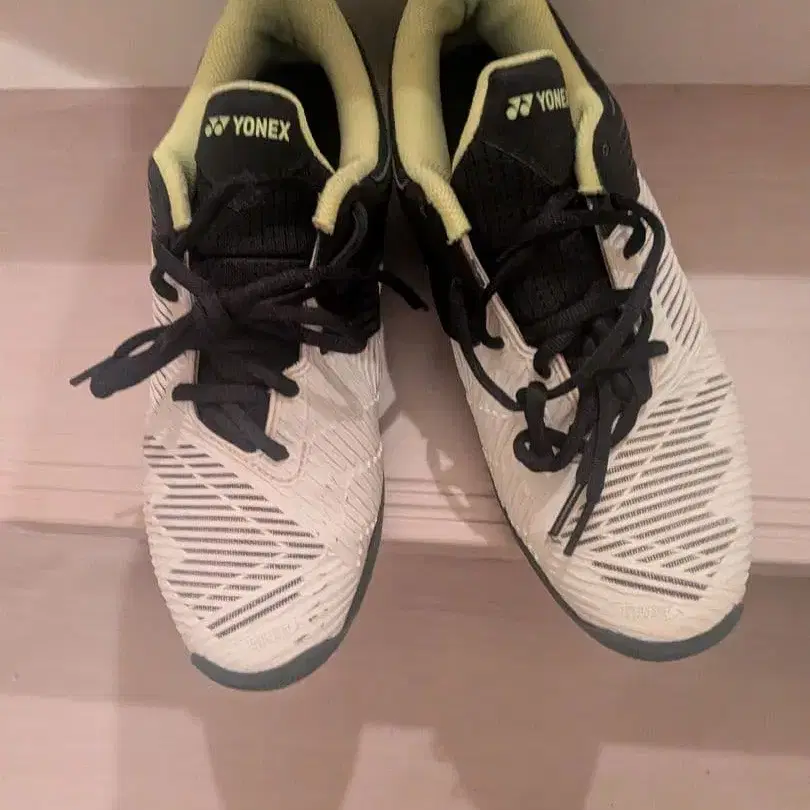 어린이가 테니스 스쿨에서 주 1회만 사용했습니다. 실내에서 사용했기 때문에 깔끔합니다. YONEX의 화이트와 라임 색상 테니스화는 뛰어난 핏감과 퍼포먼스를 제공합니다. - 브랜드: YONEX - 색상: 화이트/블랙/라임 - 스타일: 테니스화 방문해 주셔서 감사합니다.