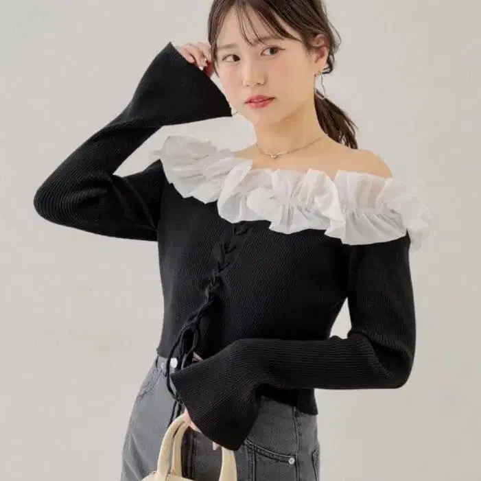 [ Chico ] 프릴 도킹 소매 플레어 니트 블랙