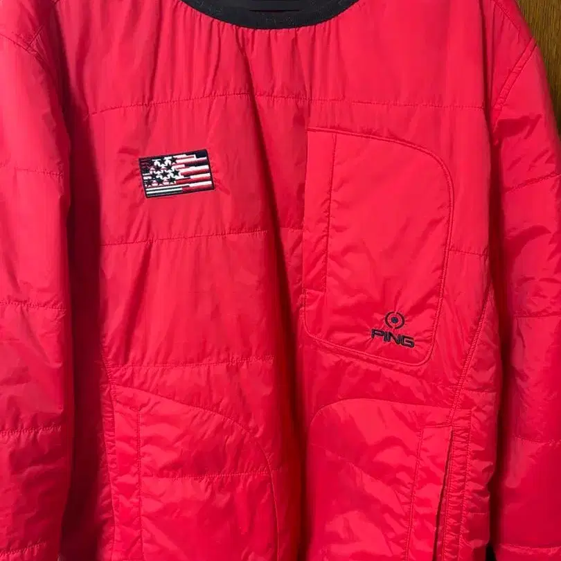 미국 국기 자수의 레드 자켓, 3L 사이즈, 크루넥 디자인.