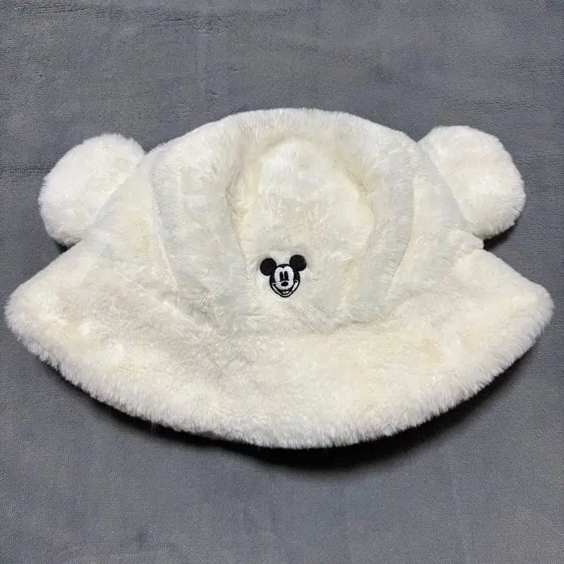 미키마우스 자수가 들어간 화이트 퍼 소재의 모자, 사이즈 58cm.
