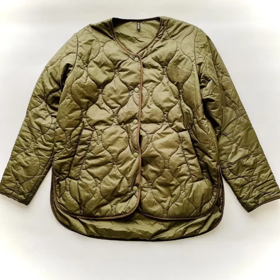 DANSKIN (댄스킨)의 퀼팅 자켓입니다. 차분한 카키 색상에 둥근 퀼팅 스티치가 특징인 아이템입니다. 노카라 디자인으로 이너를 가리지 않고 깔끔한 인상을 줍니다.