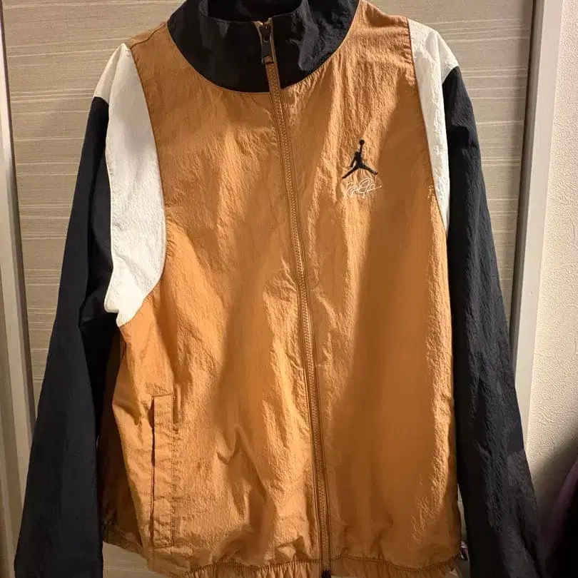 나일론 소재의 풀 지퍼 자켓, 점프맨 로고 포함.