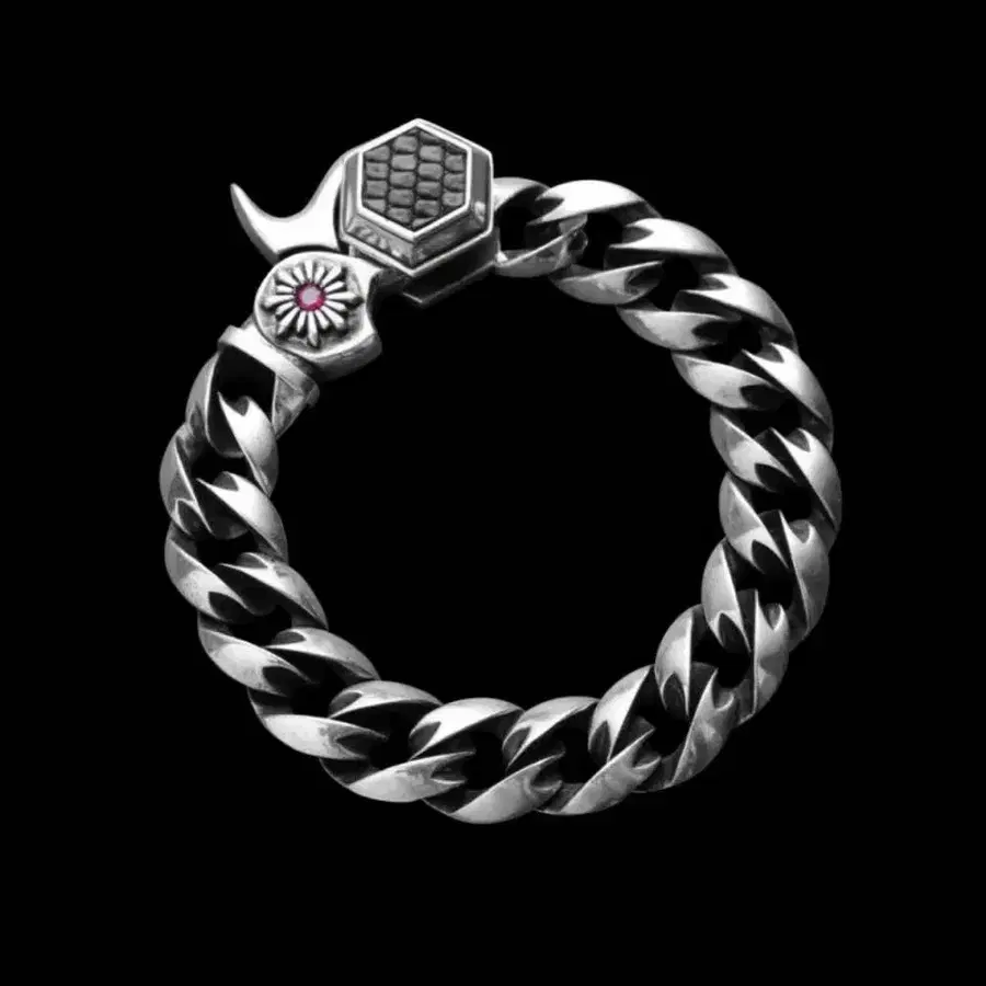 실버 925 소재의 팔찌. 키헤이 타입의 중후한 존재감 속에 조형미를 의식한 섬세한 표현이 이루어진 밸런스가 좋은 일품. 클립 사양, 클립부에는 루비를 배치하여 품격이 느껴지는 인상을 줍니다. 잠금 부분에는 도마뱀 가죽을 배치하고, 섬세한 가죽 사용을 디자인에 녹여낸 브랜드다운 액세서리로 완성했습니다. 디자인성과 기능성을 고려한 밸런스 잡기 쉬운 머스트 아이템 볼륨감으로 어떤 코디네이트에도 잘 어울리게 착용하실 수 있는 일품.