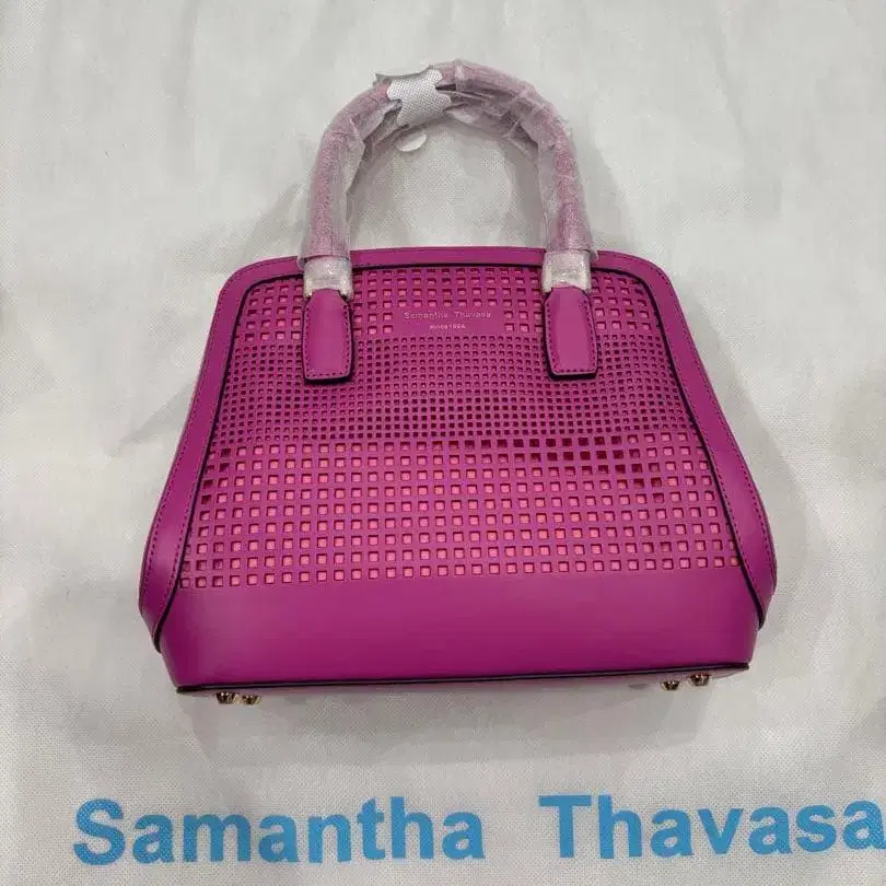 메쉬 디자인의 핑크 핸드백, 숄더 스트랩 포함.