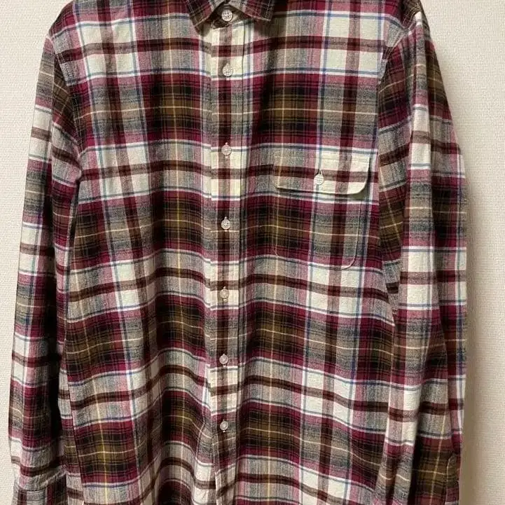 플란넬 소재의 체크 무늬 플란넬 셔츠, 왼쪽 가슴 포켓 부착.