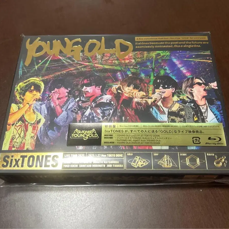 럭셔리한 골드 디자인의 Blu-ray, SixTONES의 YOUNG OLD 수록. - 타이틀: YOUNG GOLD - 아티스트: SixTONES - 디스크 수: 4 (본편, 비주얼 코멘터리, MC digeST, CD) - 수록 내용: golden, GONG 등의 악곡 - 48P 소책자 포함 디스크 1, 2는 몇 회 시청 완료, 디스크 3, 4의 CD는 미재생입니다.