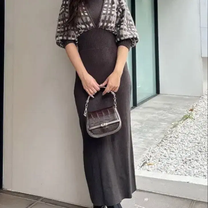 립 서비스 체크 자카드 앙상블 니트 원피스 블랙