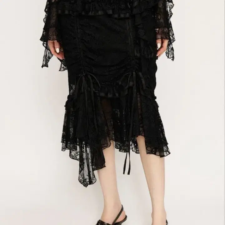 • RUFFLE 블랙 플레어 롱 스커트 레이스풍
