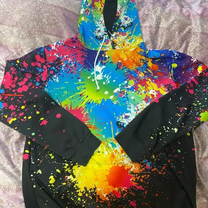 컬러풀한 스플래쉬 디자인의 XXXL 후드티. - 색상: 컬러풀한 스플래쉬 디자인 - 사이즈: XXXL - 스타일: 후드 부착 후드티 - 디자인: 앞면과 뒷면에 스플래쉬 프린트
