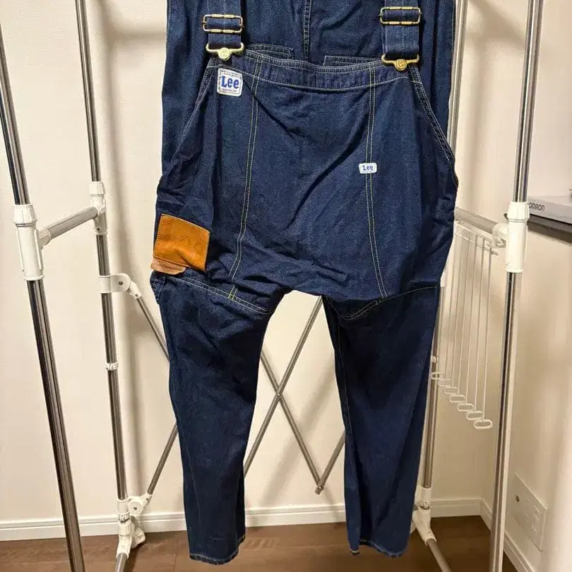 microbeaucoup 메르시보쿠 Lee 데님 팬츠 블루 ( 진한 파랑 ) M L 사이즈이신 분도 착용 가능하다고 생각합니다. 살로펫 부분은 사이즈 조절 ( 늘어뜨리는 정도 ) 가능. 지퍼 안쪽에 보정 흔적 있음. 가죽 패치 등에 주름 있음.
