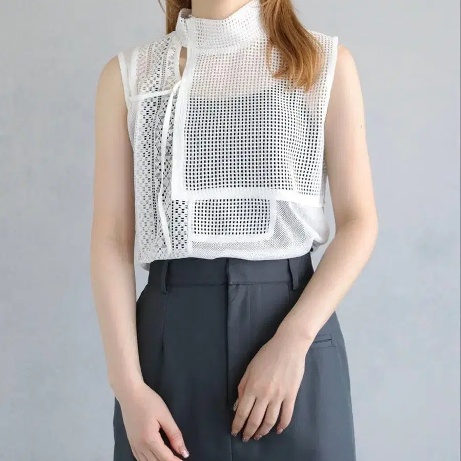 메쉬 패턴의 화이트 슬리브리스 상의, 핏감 있는 디자인으로 스타일리시합니다.