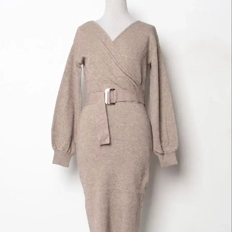 벨트가 달린 랩 디자인의 긴팔 니트 원피스, 베이지 컬러.