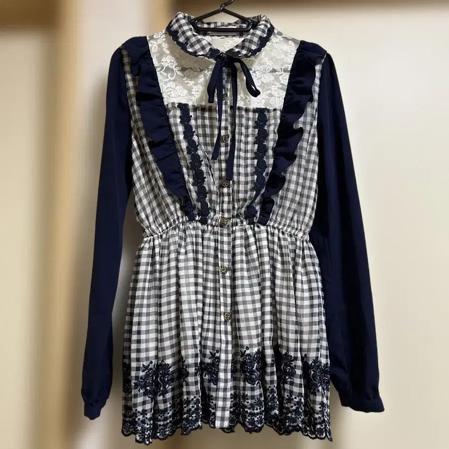 네이비와 체크 무늬의 프릴이 달린 긴팔 미니 원피스, 레이스 디테일이 특징입니다. - 색상: 네이비와 체크 무늬 - 디자인: 프릴과 레이스 디테일 - 소매 길이: 긴팔 - 스타일: 상의 방문해 주셔서 감사합니다. 사이즈 - S