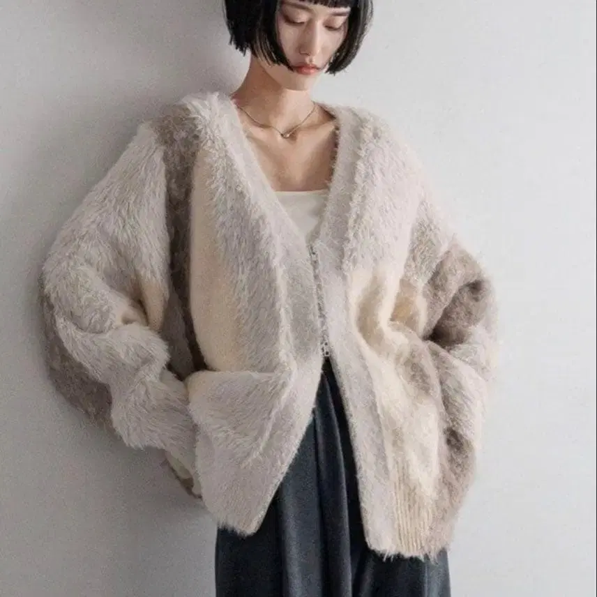 아이보리와 그레이 색상의 부드러운 퍼 소재 가디건.