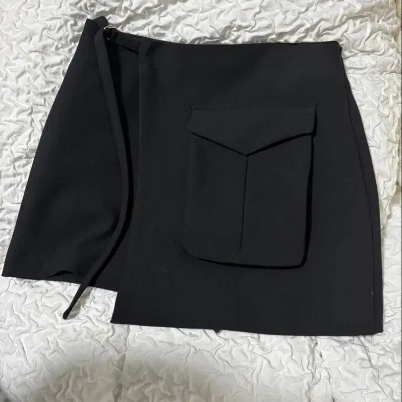 포켓이 달린 블랙 랩스커트이며, 사이드에 벨트가 있어 스타일리시합니다.