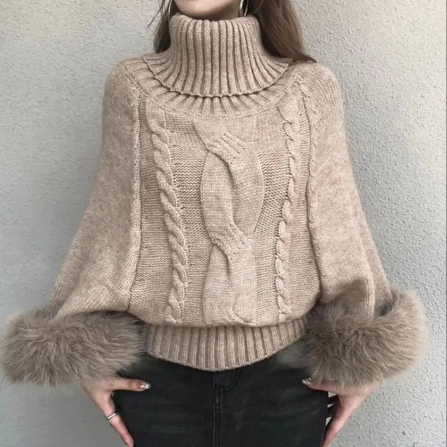 veila 인조 모피 포함 케이블 니트 판초