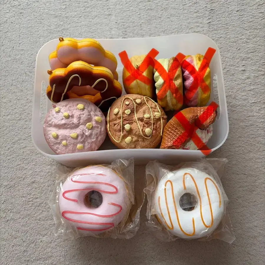 스퀴즈 카페 DEN CAFE DEN 세트입니다! 낱개 판매도 가능하니 편하게 댓글 남겨주세요 ^_^ 정품 빵처럼 보일 정도로 퀄리티가 높고, 저반발이라 부드러워 계속 만지고 싶어집니다. 보기에도 귀여워서 상자에 넣어 장식해 두었지만, 만지거나 소꿉놀이용으로도 사용할 수 있을 것 같습니다. 갈라짐이나 주름이 있는 물건은 개별적으로 사진을 올렸으니 확인해주세요. 마지막 사진은 갈라짐이 없는 물건들을 모아둔 것입니다. 스트랩은 모두 제거했기 때문에 없지만, 스퀴즈 상태는 몇 번 만진 정도이며 만지지 않은 것을 포함하면 거의 미사용이라 매우 깨끗합니다. 구매하시는 분께는 소정의 덤도 함께 드립니다. 꼭 검토해주세요 ♪ 끝까지 봐주셔서 감사합니다.