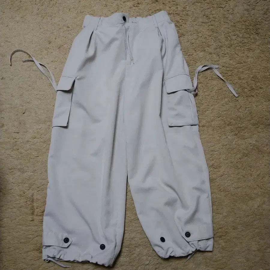 인심 58cm, 허리는 밴딩, 여유로운 S 사이즈, 색상은 연한 그레이, 착용 횟수 10회 정도, 밑단은 끈이나 버튼으로 조절 가능합니다. 얇은 원단이라 겨울 외 계절에 착용 가능합니다. 새상품급입니다. 인터넷에서 약 6800엔에 구매.