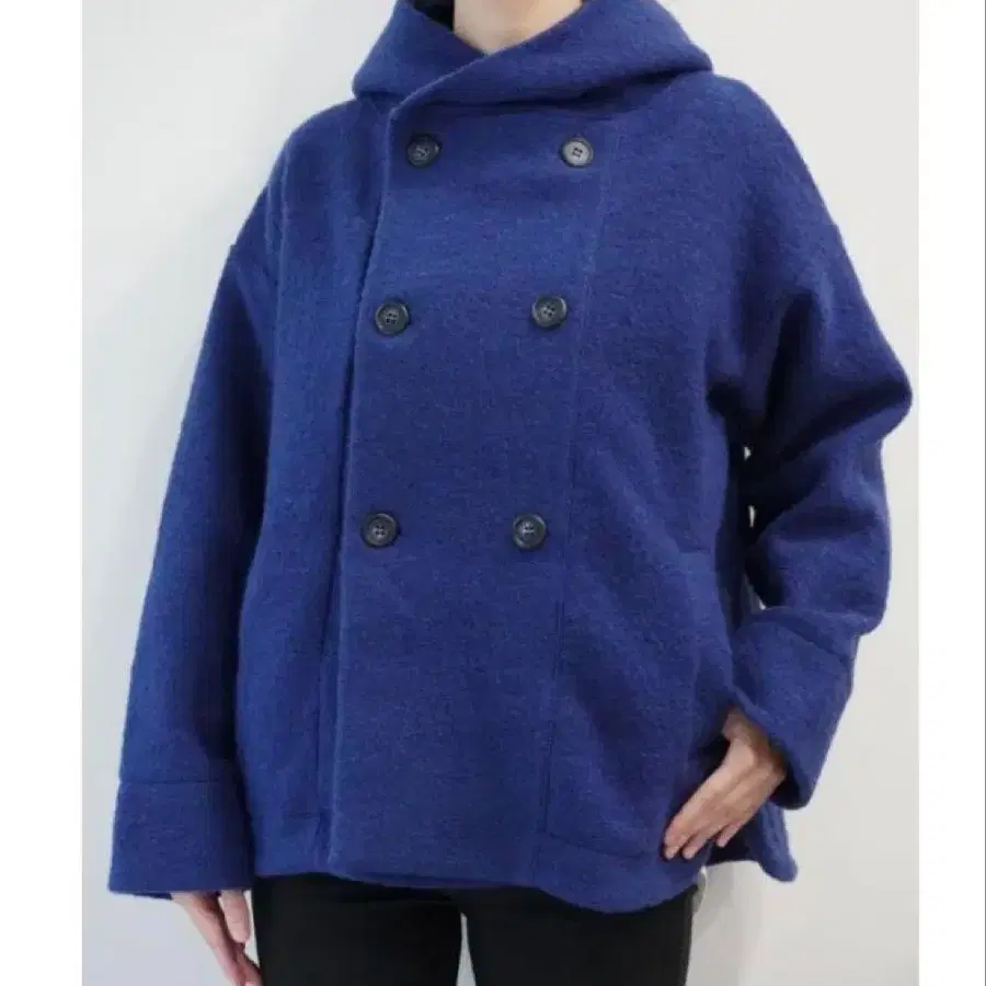 mao made의 압축 울 후드 P 자켓입니다. 색상은 블루이며 기모 울 원단으로 제작되었고, 안감이 부착되어 있습니다. 후드 부착, 프론트는 더블 버튼 사양이며, 백 중앙에 박스 플리츠가 들어 있습니다. 양쪽 허리에 포켓이 부착되어 있습니다.