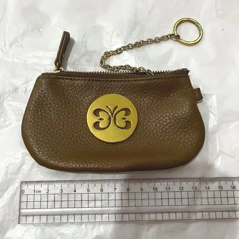 브라운 색상의 가죽 코인 케이스, 나일론 내부, 로고 포함. 미사용