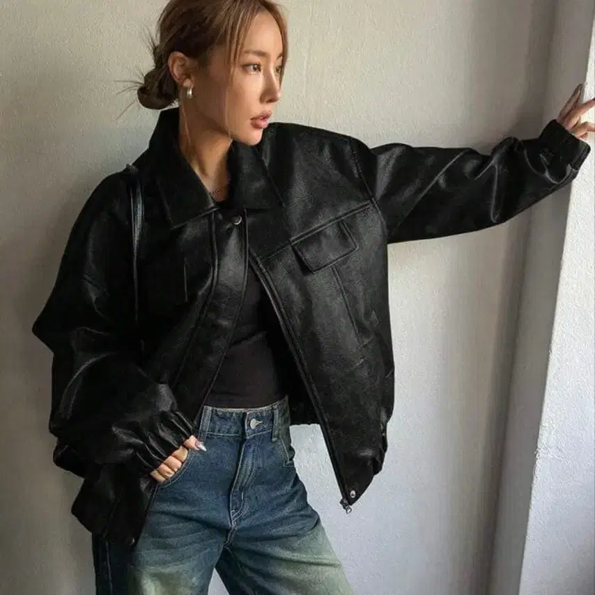오버 사이즈 블랙 레더 자켓, M 사이즈로 스타일리시한 디자인.