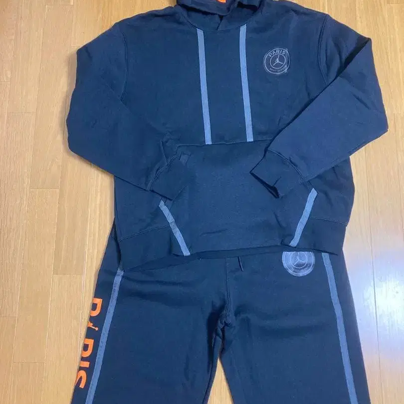후드 부착 블랙 맨투맨, PARIS 로고 디자인, 상의 2XL 하의 XL.