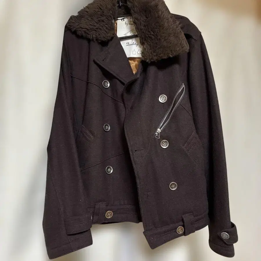 울 소재의 다크 브라운 더블 브레스트 피 코트, 퍼가 달린 옷깃과 지퍼 포켓이 특징입니다. - 색상: 다크 브라운 - 소재: 울 - 브랜드: manydays - 디자인: 더블 브레스트 - 옷깃: 퍼 부착 - 포켓: 지퍼 포켓 부착 방문해 주셔서 감사합니다.