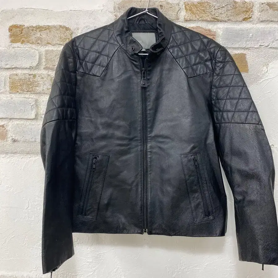 퀼팅 디자인의 블랙 가죽 자켓, 앞면 지퍼로 스타일리시합니다.