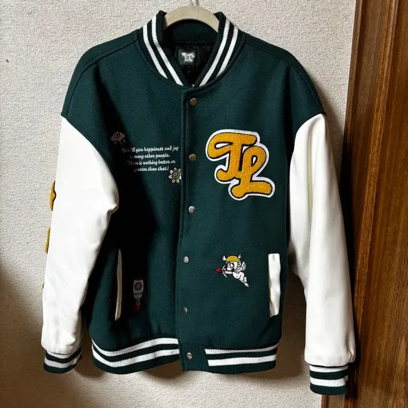 다크 그린과 화이트 색상의 바시티 자켓, 자수 디자인이 특징입니다. - 색상: 다크 그린/화이트 - 디자인: 자수 - 메시지: Life is what You make it - 브랜드명: This is Life 방문해 주셔서 감사합니다.