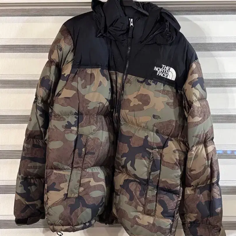 카모플라쥬와 블랙 색상의 다운 자켓, XL 사이즈로 따뜻함과 스타일을 겸비했습니다.
