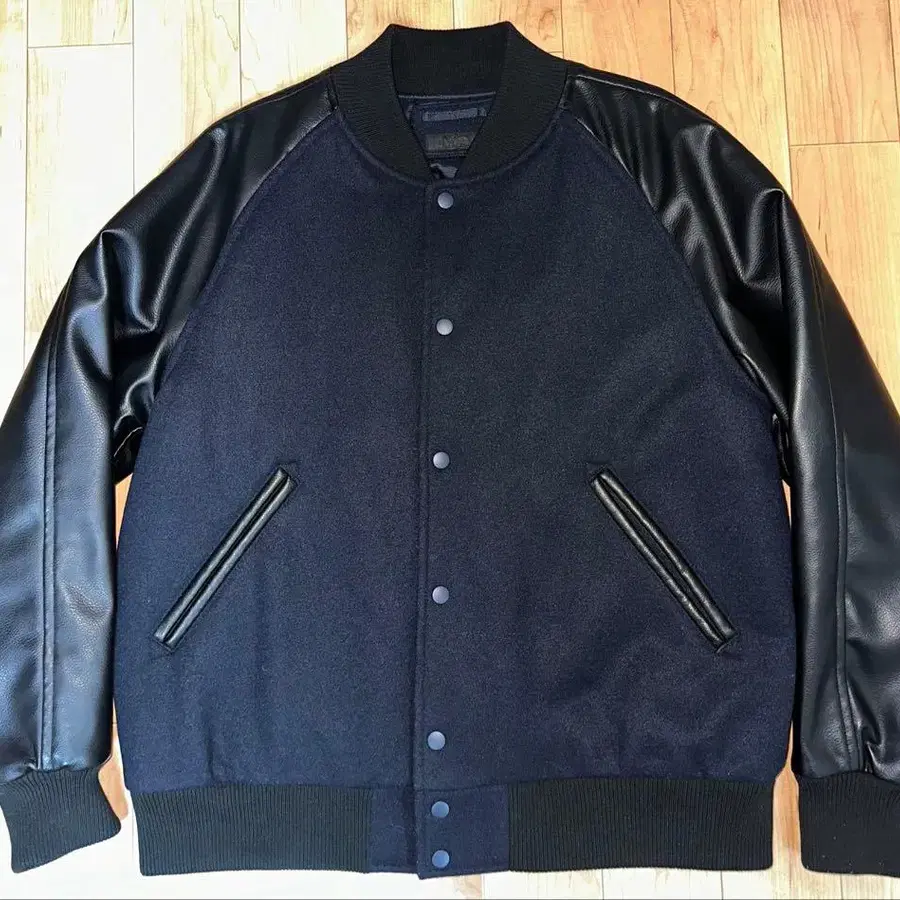 자동 번역되었어요. 원문보기울과 가죽 바시티 자켓, 네이비 색상에 래글런 슬리브 디자인.