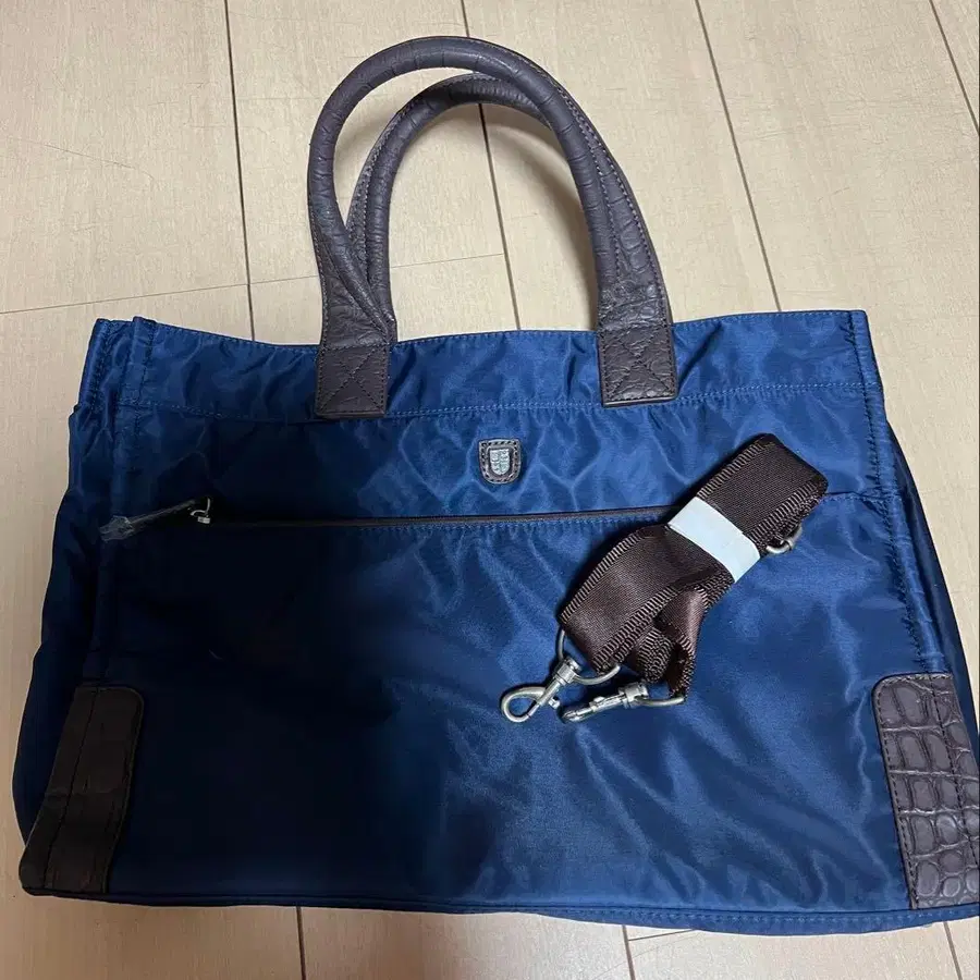 나일론 소재의 네이비 비즈니스 백, 빨간색 내부와 탈부착 가능한 스트랩 포함.