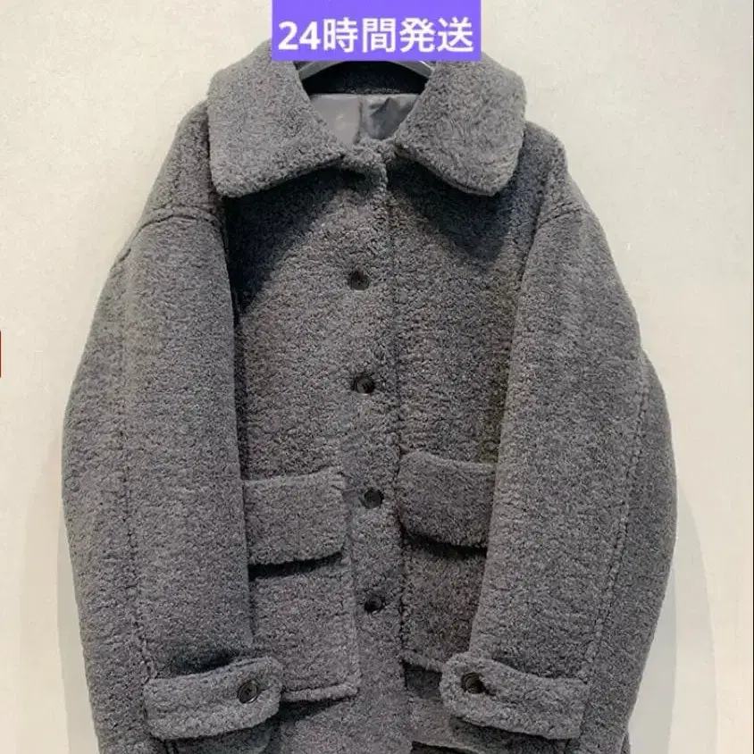 부드러운 보아 소재의 그레이 색상 자켓으로, 라운드 옷깃과 플랩 포켓이 특징입니다.