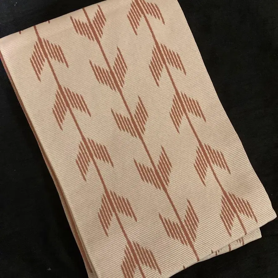 아마색에 화살이 곧바로 되돌아오지 않는다는 길한 의미가 담긴 벽돌색 화살 깃털 패턴이 멋스러운 반폭 오비. 뒷면은 벽돌색 체크 패턴.