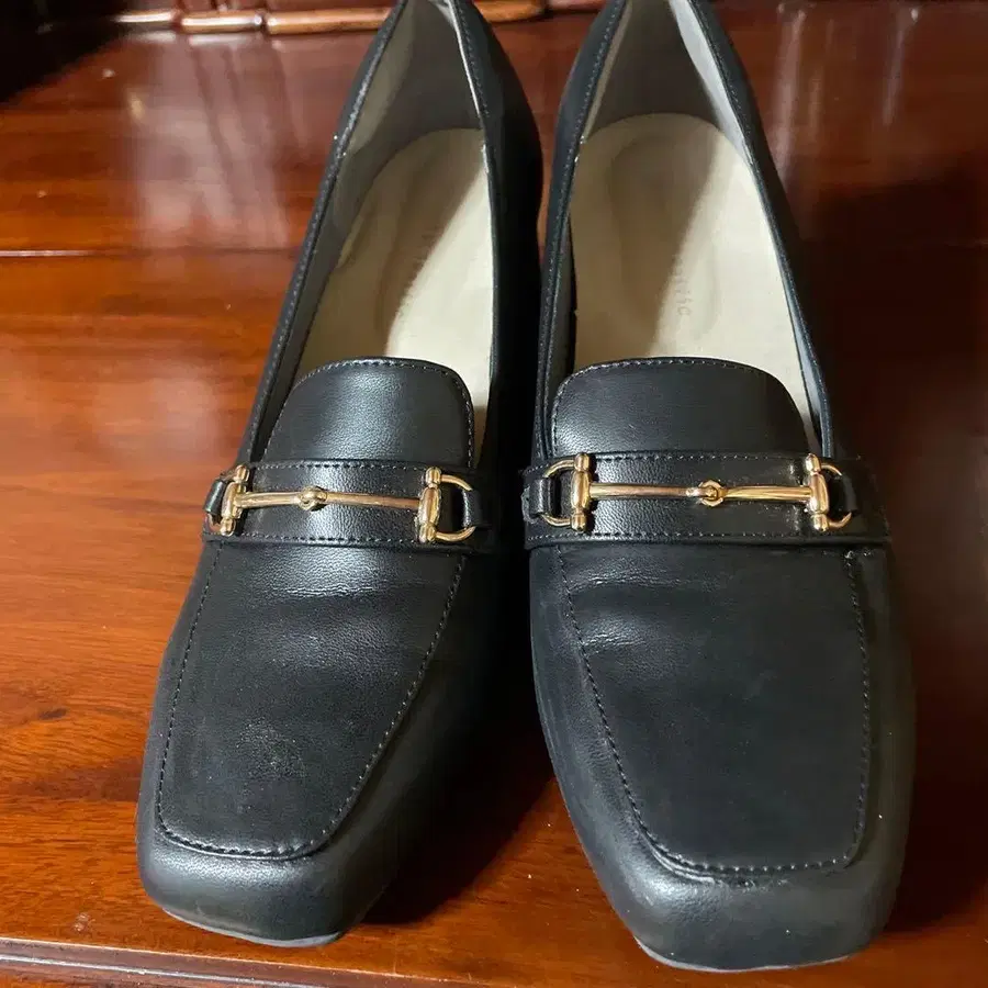 스퀘어토 디자인의 블랙 펌프스, 골드 금장 장식 포함. - 색상: 블랙 - 디자인: 스퀘어토 - 장식: 골드 금장 장식 - 밑창 소재: 러버 솔 - 스타일: 펌프스 방문해 주셔서 감사합니다. 사이즈 - 25cm 상자는 없습니다. 실내에서 1회만 착용했습니다.