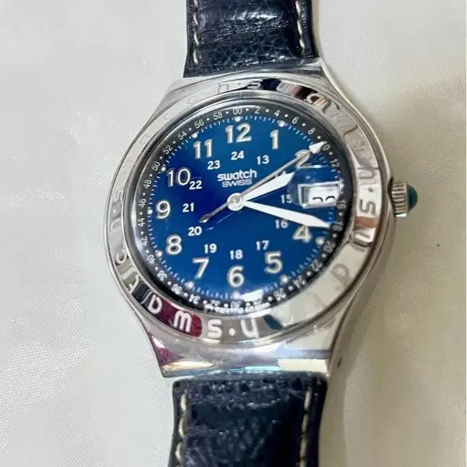 스와치 쿼츠 손목시계 파랑 다이얼 가죽 파란색 다이얼과 가죽 스트랩을 갖춘 스와치 쿼츠 손목시계. - 브랜드: swatch - 색상: 파랑 - 벨트 소재: 가죽 - 뒷면 디자인: 스틸 백 방문해 주셔서 감사합니다.