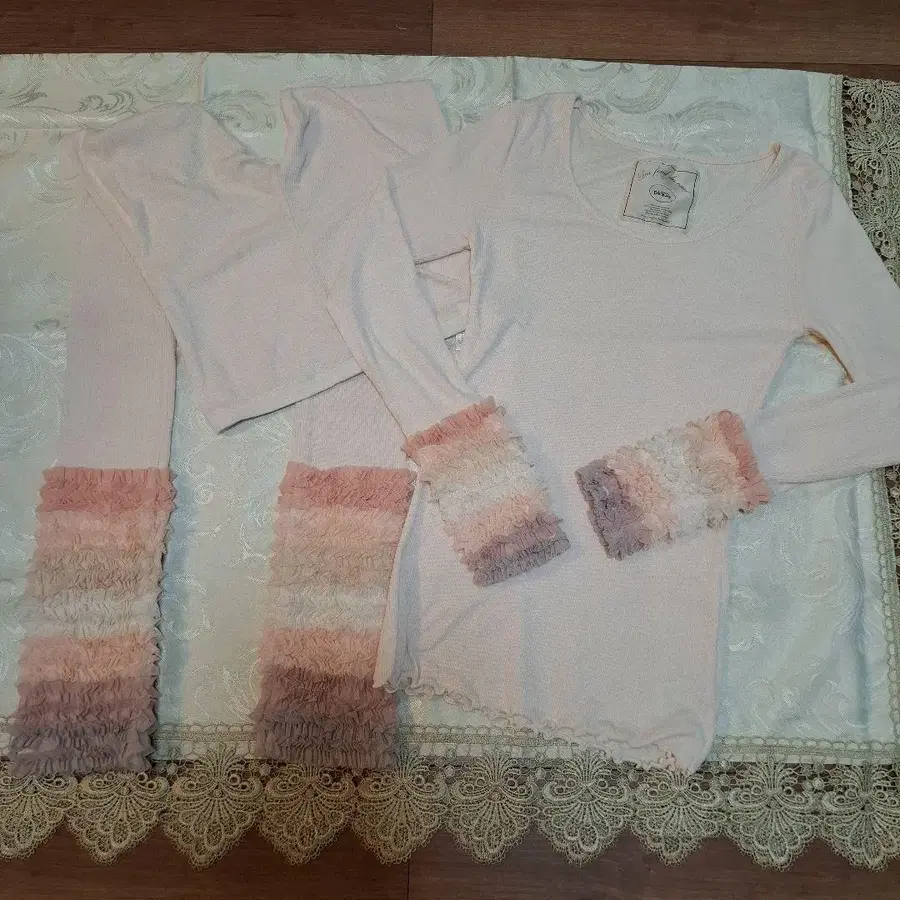 부드러운 원단의 핑크 계열 긴팔 T셔츠, 롱 바지 프릴 디자인으로 귀여움을 연출.