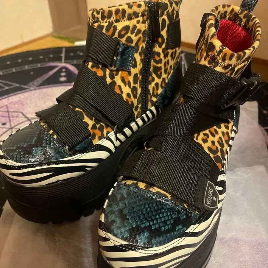 레오파드 무늬, 제브라 무늬, 뱀 무늬의 하이브리드 디자인. 안쪽 지퍼로 신기 편한 숏부츠. 화려해서 발끝을 멋지게 연출하고 싶은 분에게 좋을지도 모르는 신발. 2번 정도 신었지만, 제 복장과 잘 어울리지 않아 보관해 두었던 것을 판매합니다. 사이즈 - 22.5cm