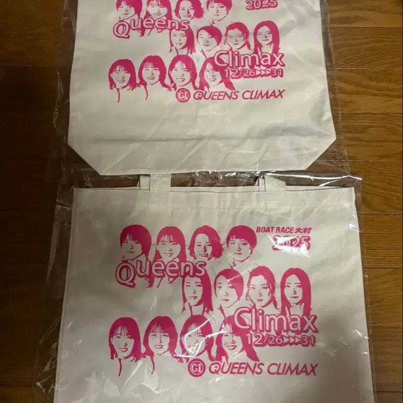 BOAT RACE 2025의 Queens Climax 토트백, 핑크 인쇄 디자인이 특징입니다.