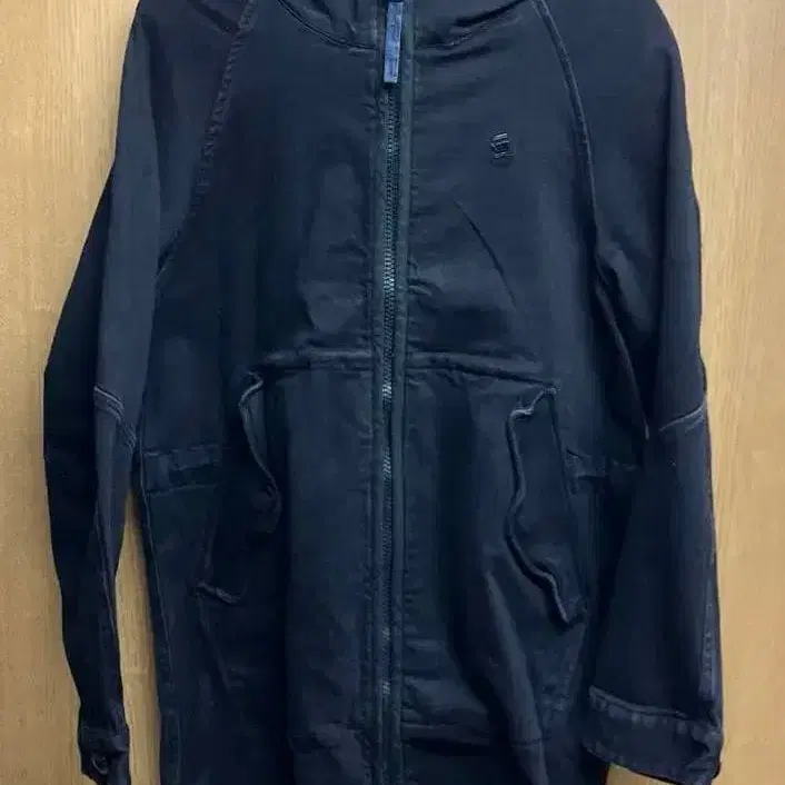 블랙 데님 원단과 깊은 스노클 후드가 인상적인 디자인입니다.