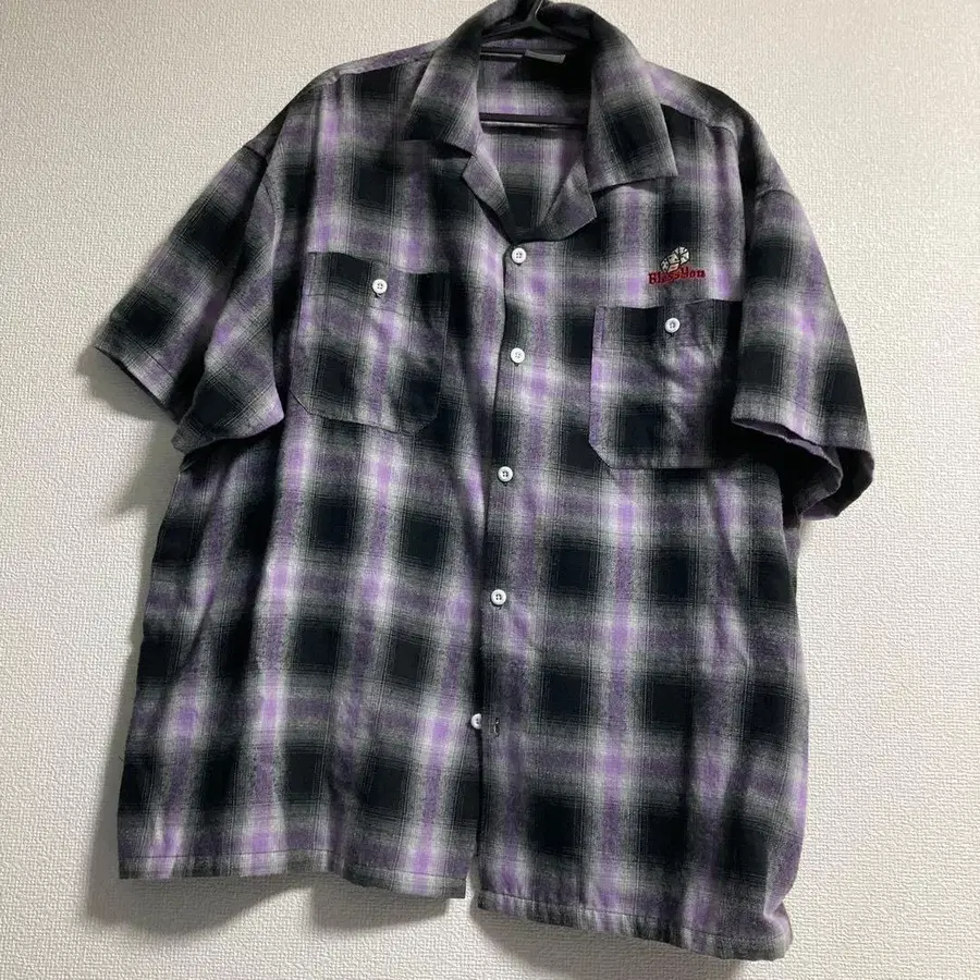 블랙과 퍼플 체크 무늬, 자수 로고가 있는 플란넬 셔츠. - 브랜드: Bless You All - 색상: 블랙/퍼플/그레이 - 디자인: 체크 무늬 - 특징: 자수 로고 포함 - 제조국: 미국제 방문해 주셔서 감사합니다. 사이즈 - M