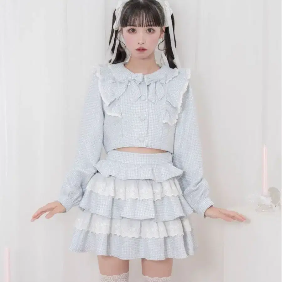 honey cinnamon 허니시나몬 코튼 레이스 트위드 셋업 정가 16500엔 공식 사이트에서는 그레이 색상으로 표기되어 있지만, 실제로는 스카이블루에 가깝습니다. 택 포함 미사용 새상품입니다. 양산형 지뢰계 유니폼 셋업 원피스 스카이블루 파랑
