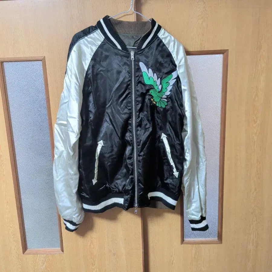 새틴풍 원단에 새와 고양이 자수가 들어간 스카잔. - 색상: 블랙과 화이트 - 디자인: 앞면에 그린 새 자수 - 디자인: 뒷면에 새와 고양이 자수 - 소재: 새틴풍 원단 - 소매: 화이트 새틴 긴팔 - 리브: 블랙과 화이트 스트라이프 - 포켓: 앞면에 지퍼 포켓 방문해 주셔서 감사합니다.