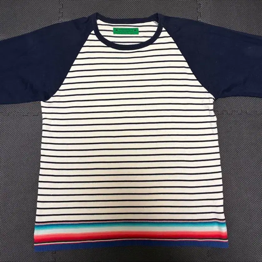 스트라이프 패턴의 래글런 슬리브 T셔츠, 컬러풀한 밑단 디자인이 특징. - 브랜드: SASQUATCHfabrix. - 색상: 네이비/화이트 - 스타일: 래글런 슬리브 - 밑단 디자인: 컬러풀한 스트라이프 - 택: 고성능 신선함을 제공 사이즈 - L 중고이므로 이해하시는 분만 구매 부탁드립니다.