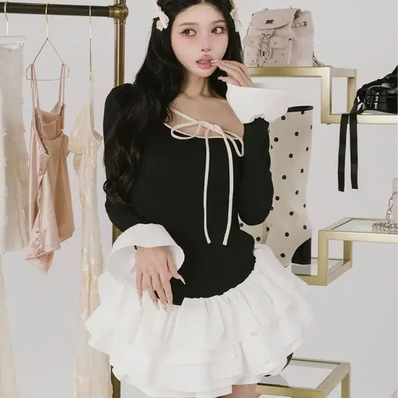 디자인 넥 리본 미니 원피스 FREE / BLK